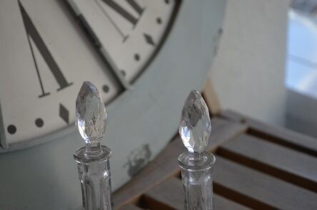 コンディション : 経年による、シミ、キズ、汚れ、サビ、ヒビ、カケなどあります。ガラスのオイルとヴィネガーの瓶の栓上部先が両方ともカケ(写真3)ていますが、あまり目立たないと思います。又、ガラスの塩胡椒入れの1個にヒビ(写真4)があり、カケも見られます。ガラス全般に数ケ所気泡など入っています。又、製造時のキズもあります。中央のマスタード入れは蓋があったものと思われますが、残念ながらございません。全体的には大変良好でで素敵なセットです