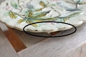 コンディション : 経年による、シミ(写真2)、キズ、汚れ、貫入などあり、表面に1か所カケ(写真5下〇)があります。又、キズ(写真5上〇)は製造時に付いたと思われ、表面やリムなどに色が飛んだ部分(写真3,4)が見られます。全体的には大変綺麗で良好な素敵なプレートと思います