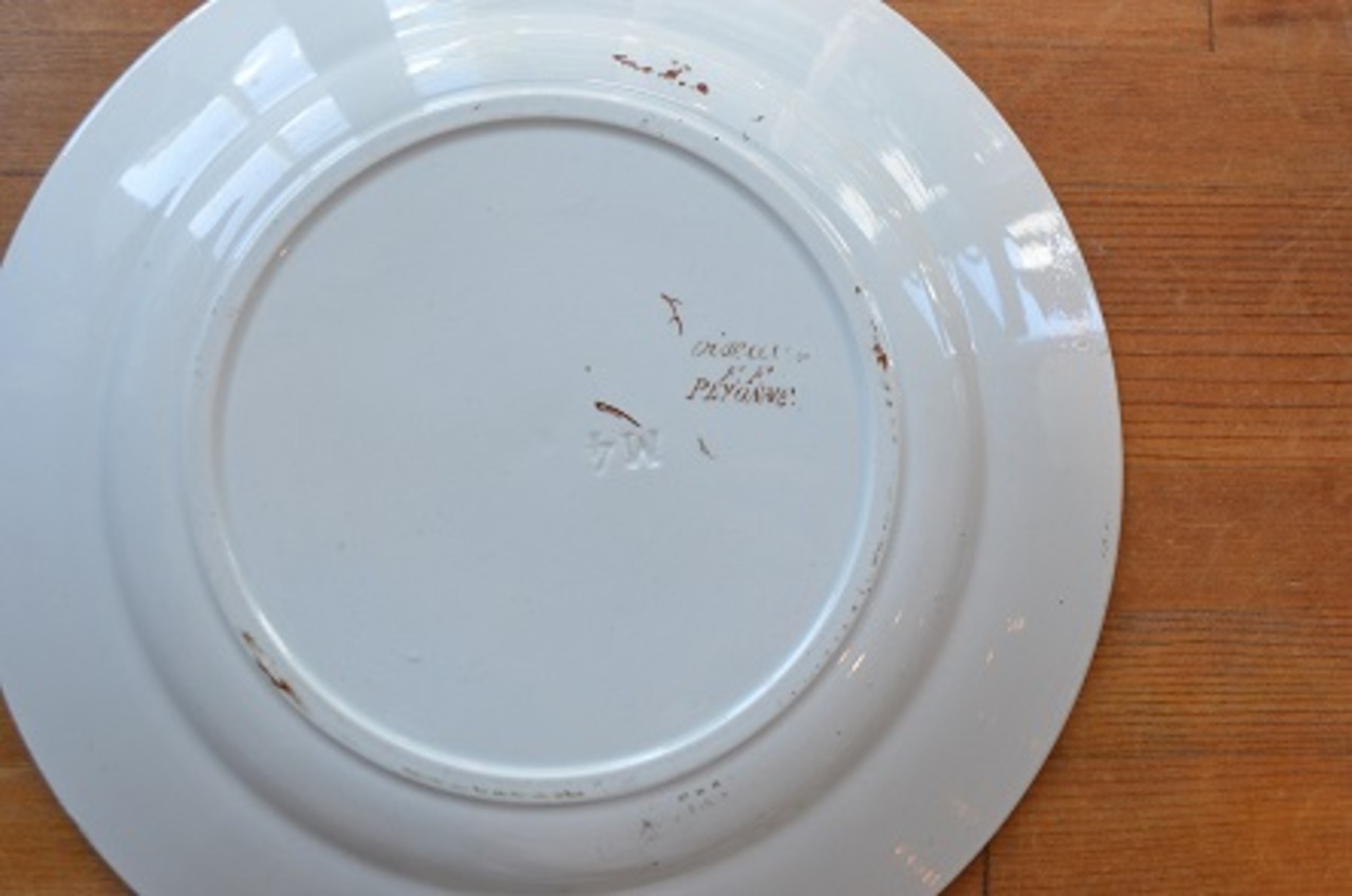 コンディション : 経年による、シミ、キズ、汚れ、貫入など若干あり、リムに極小さなカケ(写真3)がありますが、模様の部分に重なりあまり気にならないと思います。又、裏側リムに1か所カギ型に0.7×0.7cm程のヒビ(写真4)がありますが、こちらもほとんど目立ちません。尚、表面やリムに若干色が飛んでるところがありますが、こちらもそれほど気にならないと思います。全体的には大変綺麗で良好です