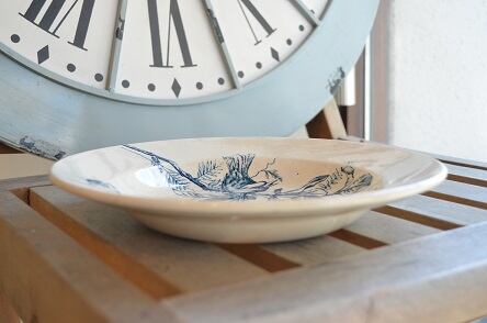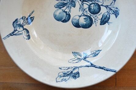 コンディション : 経年による、シミ、キズ、汚れ、貫入などあり、特にシミ(写真2,3)が全体的に広がっています。とてもレアなスーププレートですが、シミが気になる方はご遠慮ください