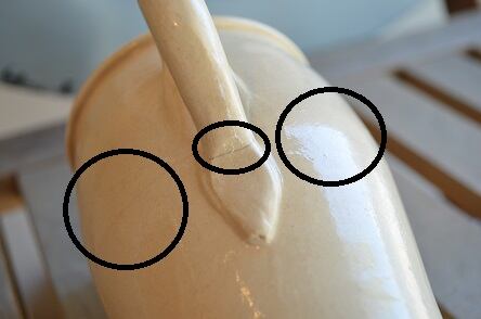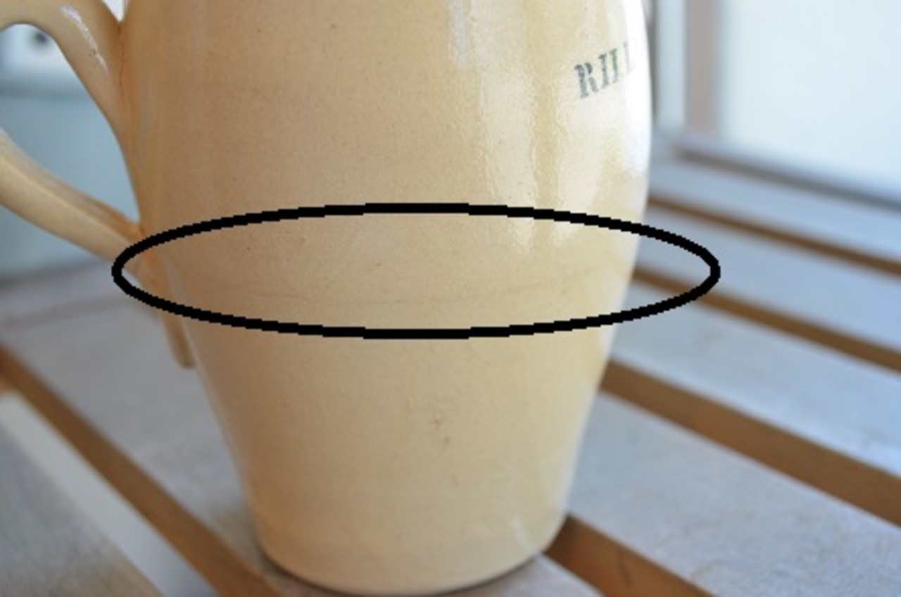 コンディション : 経年による、シミ、キズ、汚れ、貫入などあり、上部リムにカケ(写真5)がありますが、あまり目立たないと思います。又、持ち手上下部分の継ぎ目に約1.5cmずつのヒビ(写真3中〇)があり、表面中央部分に20cm程のヒビ(写真3左右〇と写真4)がありますが、こちらもあまり目立たず問題はないと思いますが、万が一のことがありますので、置いてご使用下さい。全体的には大変レアで、趣のあるポットと思います