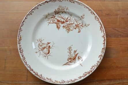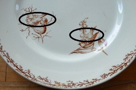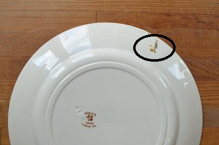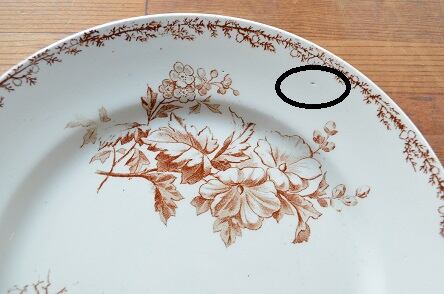 コンディション : 経年による、シミ、キズ、汚れ、貫入などあり、表面に製造時に付いたと思われるキズ(写真4)が線となり、又、製造時に色が飛んだ部分が若干黒く(写真2)なっています。又、表面にこちらも製造時に付いたと思われる凹(写真3)があります。尚、リムに極小さなカケが数か所見られますが、こちらはあまり目立たず気にならないと思います。又、裏側にも製造時に付いた汚れがありますが、こちらは裏側ですのであまり気にならないと思います。全体的には良好と思います。