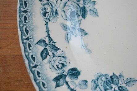 コンディション : 経年による、シミ、キズ、汚れ、貫入などあり、表面に製造時に付いたと思われるキズとグリーンの色が飛んでいます。又、リムにカケ(写真4)がありますが、あまり目立ちません。他にも極小さなカケがリムに数か所見られますが、こちらも目立たないと思います。尚、転写シートのつなぎ目(写真2)が全部で3か所ありますが、それほど気にならないと思います。又、転写がずれて、リムが若干白くなってる部分があります。全体的には悪くはないと思います。