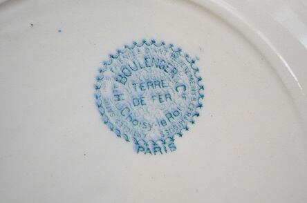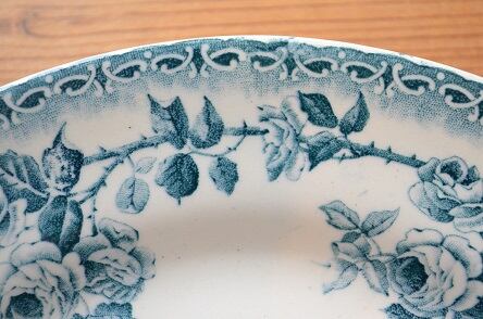 コンディション : 経年による、シミ、キズ、汚れ、貫入などありますが、目立ったカケはありません。又、表面に製造時に付いたキズとグリーンの色が飛んだ部分(写真4)があります。尚、転写シートのつなぎ目(写真2,3)が全部で3か所ありますが、それほど気にならないと思います。又、転写がずれて、リムが若干白くなってる部分があります。全体的には大変良好と思います。