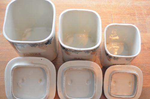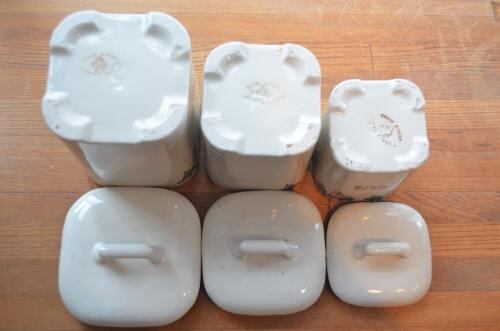 コンディション : 経年による、シミ、キズ、汚れ、貫入などあります。CAFEは目立ったカケはなく、大変良好です。SELは正面上部縁に製造時に付いたヒビと、製造時に付いたカケ(写真3)がありますが、あまり目立ちません。FARINEは、左側上部の縁から製造時に付いたヒビ(写真3)があります。全体的には、大変良好で珍しいキャニスターと思います。