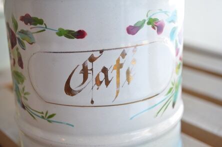 カラー : ホワイト地に薄いブルーのぼかし。縁は本体はブルー、蓋はグリーン。パンジーはパープルにイエロー、Cafeはゴールド