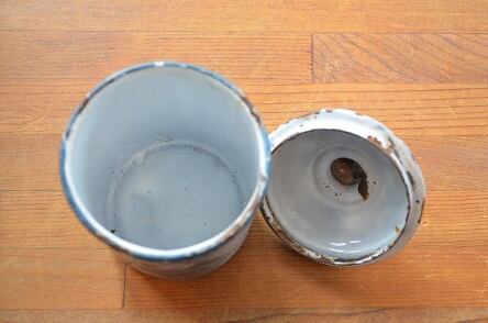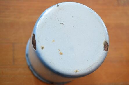 コンディション : 経年による、シミ、キズ、汚れ、サビなどあります。本体上部縁(写真2,3)、本体下部(写真4)、蓋縁(写真2,3)、蓋つまみ(写真3)にサビやカケなどあり、全体的には良好とは言えませんが、とてもかわいらしい、珍しい、チェリーのキャニスターだと思います。