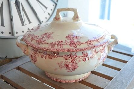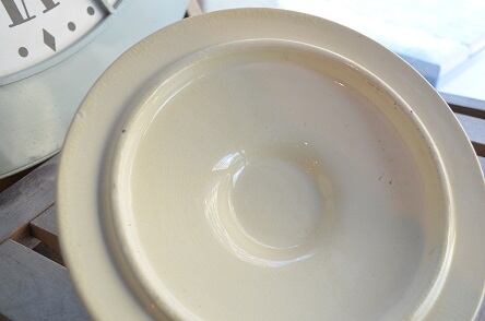 コンディション : 経年による、シミ、キズ、汚れ、貫入などあります。蓋の裏に数ケ所カケ(写真3)があります。本体の持ち手部分に2ヶ所ほど、小さなカケがあります。又、本体リムに若干の擦れ感があり、1cm程のヒビ(写真4)がありますが、いずれもあまり目立たず、全体的には大変良好と思います。尚、バックスタンプはありません。