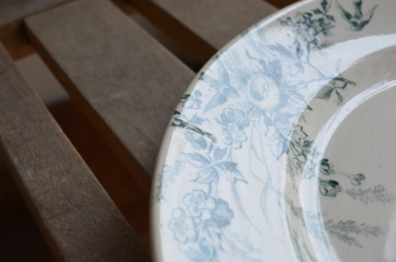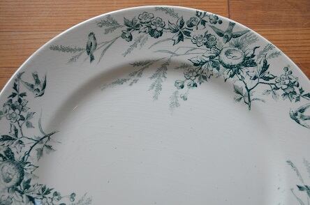 コンディション : 経年による、シミ、キズ、汚れ、貫入などあります。又、リムから中心に向かって、1.5cm位の製造時に付いたと思われる(写真4)キズがあり、先には極小さなカケがありますが、ちょうど模様の部分にかかり、ほとんど目立ちません。全体的には大変良好と思います。