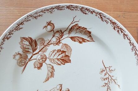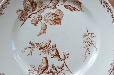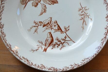 カラー : アイヴォリー地にブラウンの鳥とローズヒップなどの花のモチーフ