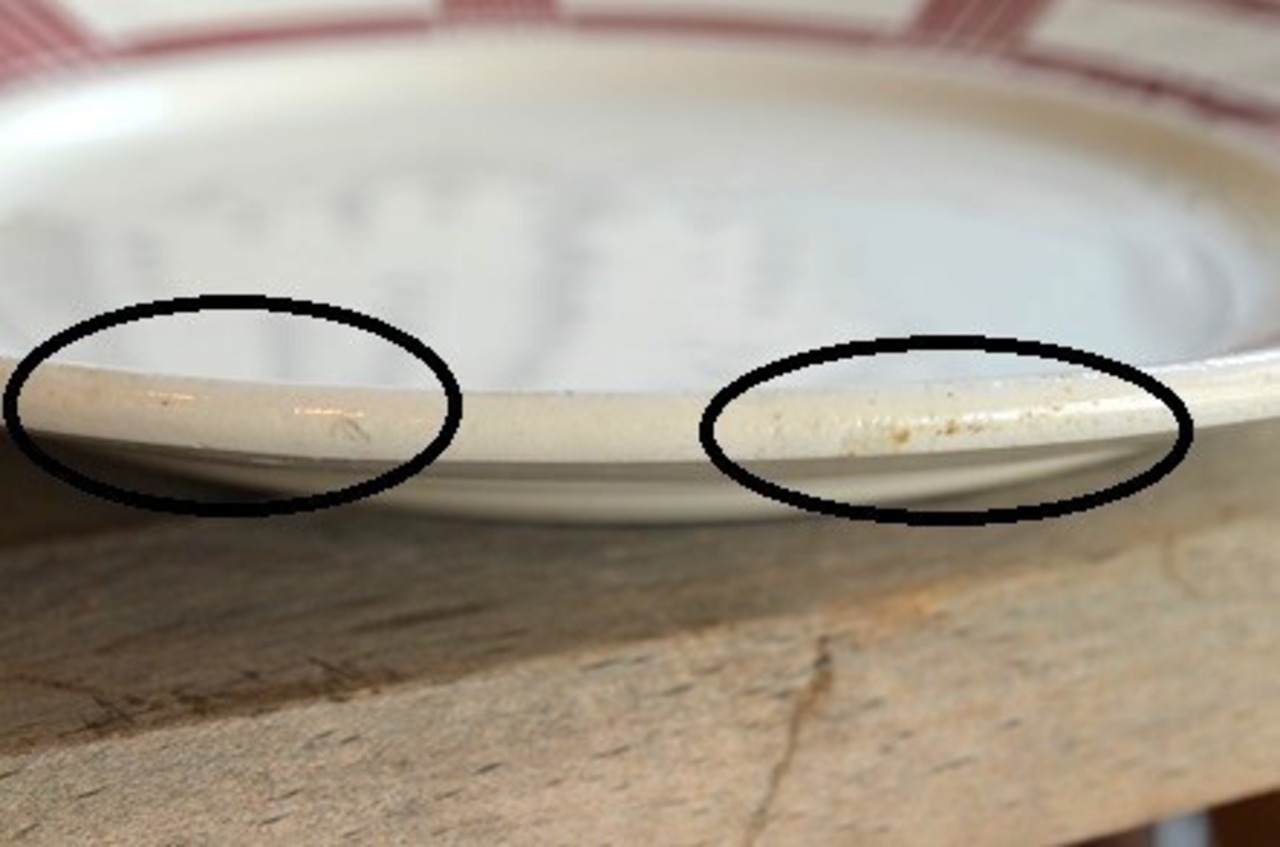 コンディション : 経年による、シミ、キズ、汚れ、貫入などあり、リムにカケて擦れてる部分(写真4)があります。又、同様に写真5もありますが、こちらはそれ程目立たないと思います。尚、表面に製造時に付いた小さな点があり、少しシミ(写真2)になっています。全体的には綺麗で良好と思います。