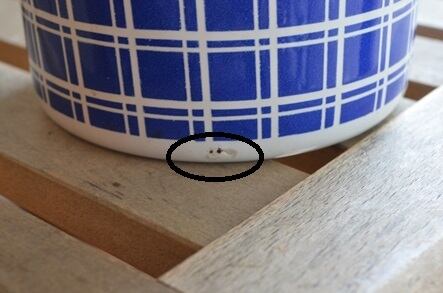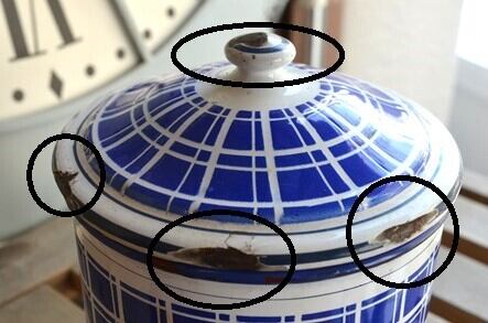 コンディション : 経年による、シミ、キズ、汚れ、サビ、カケなどあり、特にカケは、蓋リムに大きなものが4か所と小さいものが1か所、そしてつまみ(写真2,3)にもあり、蓋内側リムにも若干あります。又、本体にもカケ(写真4)があり、写真はありませんが上部にも小さなカケがありますが、こちらはそれ程目立たないと思います。全体的には蓋にダメージはありますが悪くないと思います。